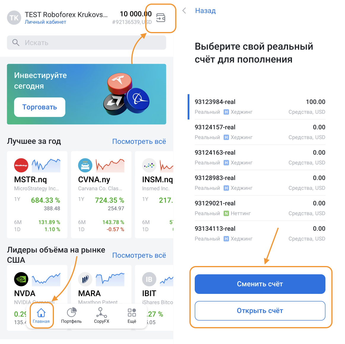 Чтобы управлять своими счетами напрямую в приложении, перейдите в "Еще" > "Торговые счета" > "Управление счетами". Здесь вы найдете все свои текущие демо- и реальные счета.