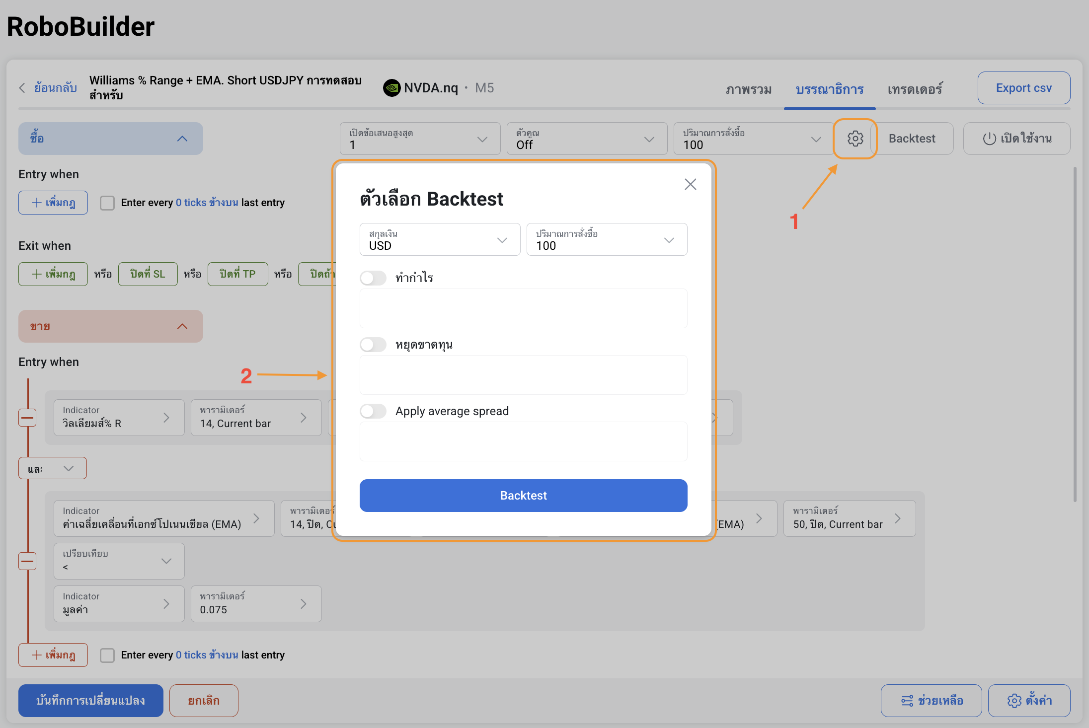 สำหรับตัวเลือกขั้นสูงของ Backtest ให้คลิกที่ไอคอนรูปเฟืองทางด้านซ้ายของปุ่ม Backtest ที่มุมขวาบนของหน้าต่างของคุณ
