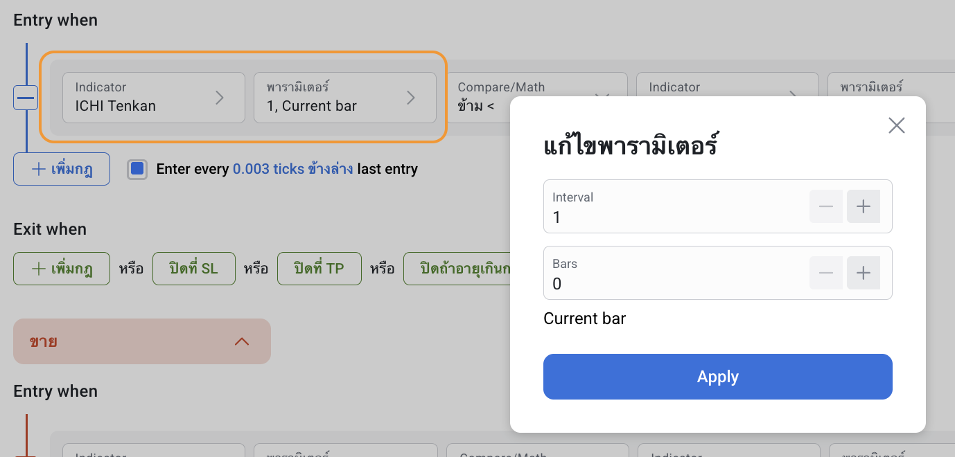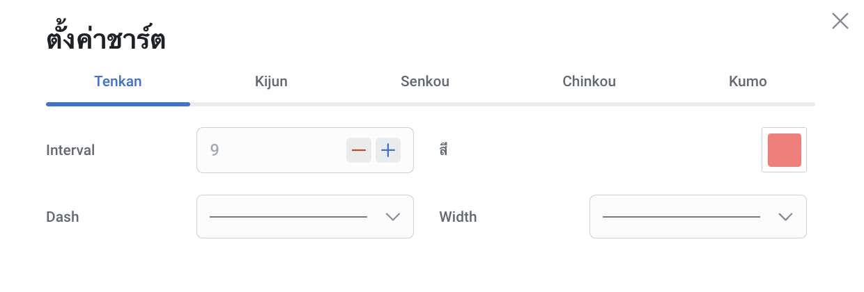 เนื่องจาก Ichimoku Kinko Hyo ประกอบด้วย 3 ส่วนแยกกัน (Tenkan, Kijun, Chinkou) แต่ละส่วนมีพารามิเตอร์และค่าเฉพาะตัว ใน RoboBuilder จึงแบ่ง Ichimoku Kinko Hyo ออกเป็น 3 อินดิเคเตอร์: