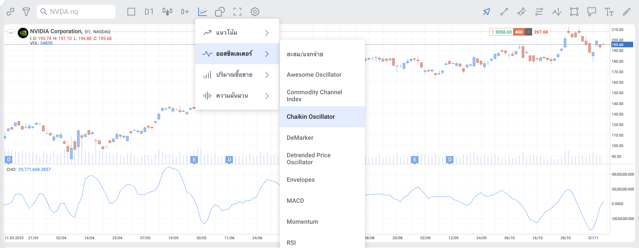 3. สุดท้าย นำผลต่างระหว่างค่า EMA ทั้งสองมาสร้างเป็น Chaikin Oscillator