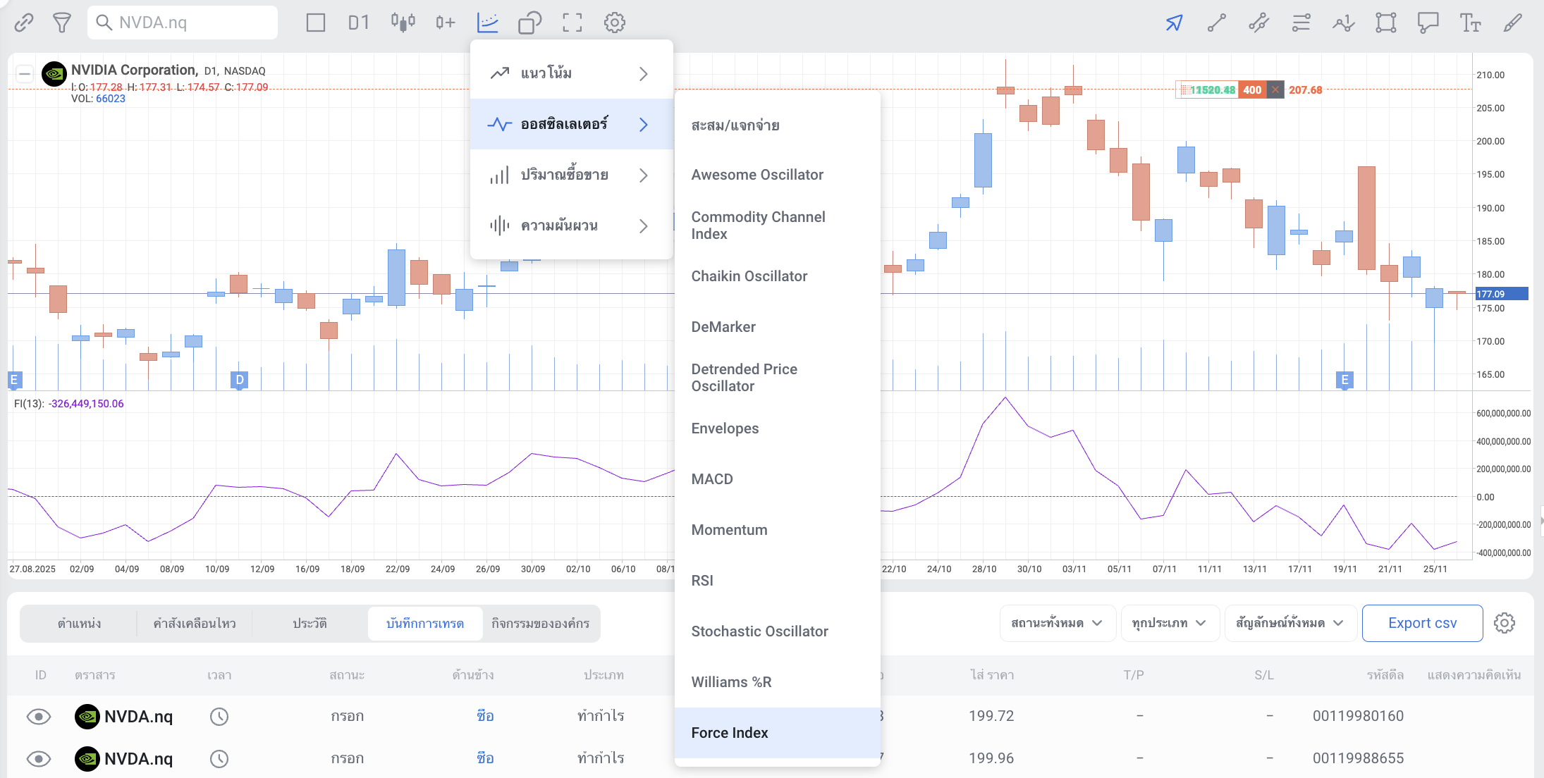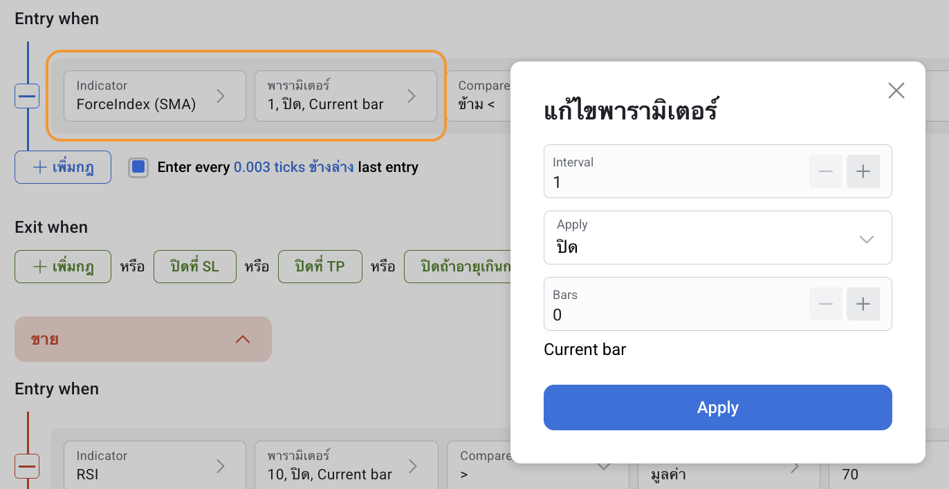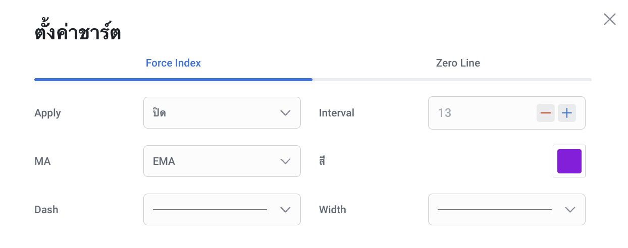 ดัชนี Force Index (EMA, SMA) สามารถใช้งานได้ทั้งแบบเดี่ยว ๆ หรือร่วมกับอินดิเคเตอร์อื่นใน RoboBuilder