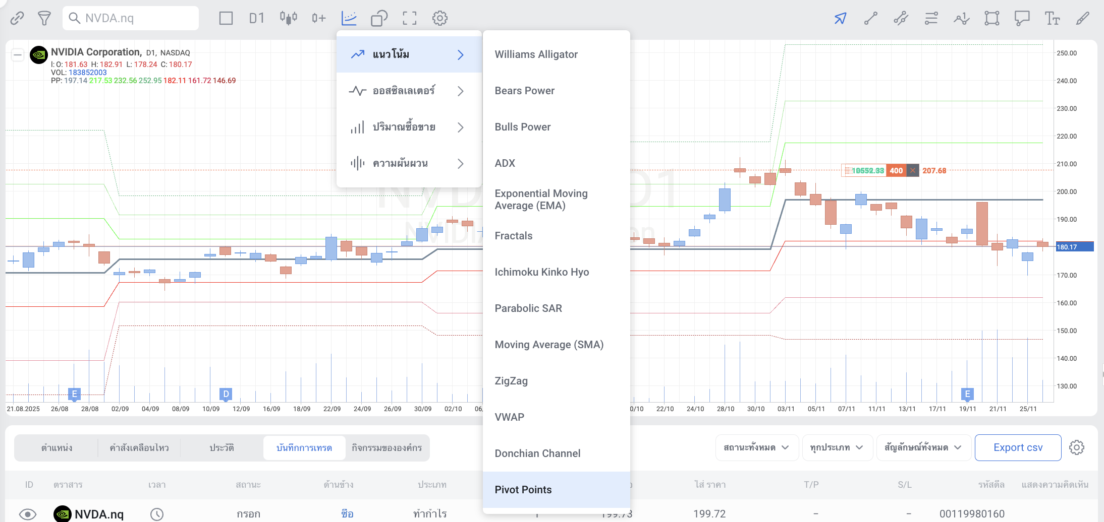 Pivot Point คืออินดิเคเตอร์ทางเทคนิคหรือชุดการคำนวณที่ใช้เพื่อระบุแนวโน้มโดยรวมของตลาดในหลายกรอบเวลา Pivot Point หลักคือค่าเฉลี่ยของราคา High, Low และ Close ของวันเทรดก่อนหน้า ในวันถัดไป หากราคาขึ้นไปเคลื่อนไหวเหนือ Pivot Point มักตีความว่าเป็นแรงซื้อ (Bullish) ในขณะที่หากราคาเคลื่อนไหวต่ำกว่า Pivot Point มักบ่งชี้ถึงแรงขาย (Bearish)